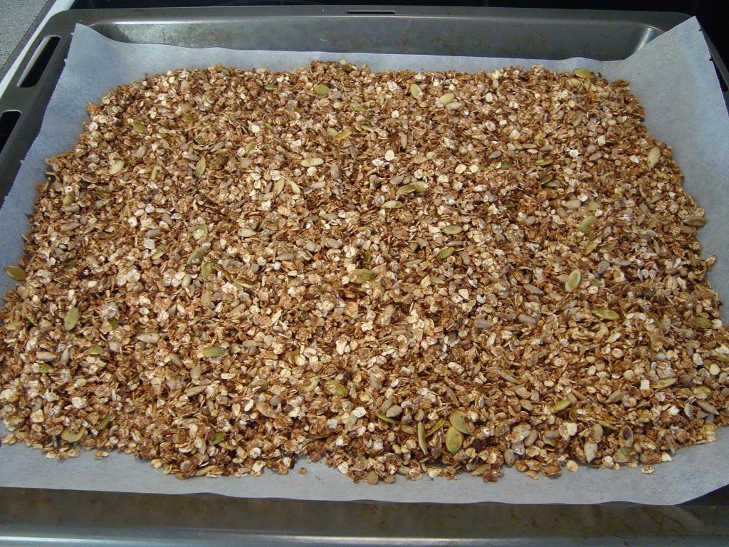 Jag gjorde en liten sats med nötblandning bredvid (se bild nedan) som jag sedan hällde över müslin när den var klar i ugnen. Man kan variera detta precis hur man vill och med vilka nötter man vill, ta det som finns hemma helt enkelt!