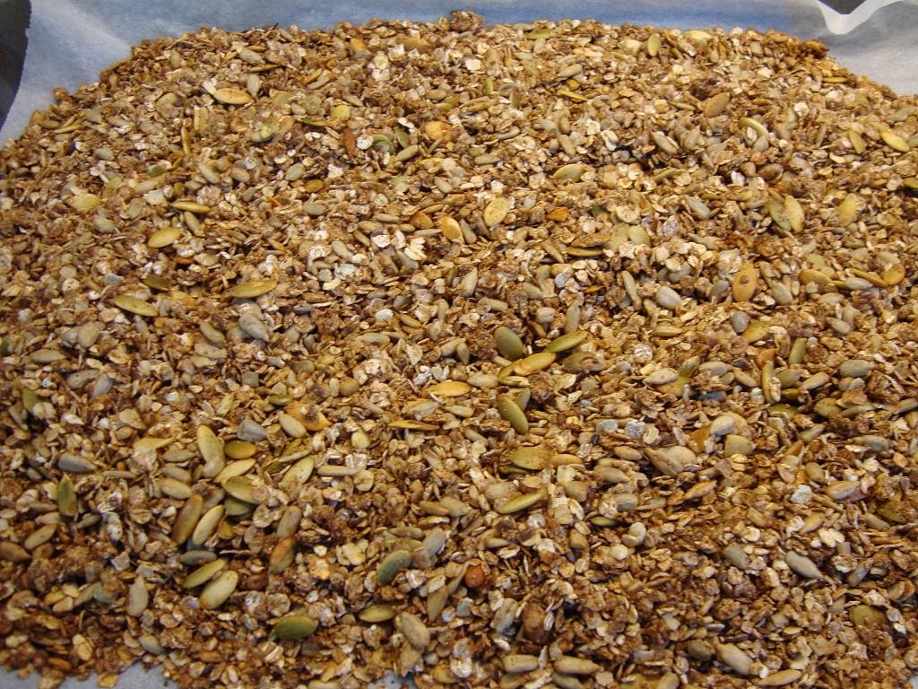 Blanda ihop alla ingredienser i en bunke, förutom honung, rapsolja, vatten och nötblandningen. Ringla över rapsoljan, honungen, droppa över vattnet och arbeta samman müslin. Ta fram en stor plåt som har lite djup, lägg på bakplåtspapper och fördela müslin på hela plåten. Rosta i ugnen på 175 ° i ca 25 min, rör om ofta och hacka sönder klumpar. Om müslin fortfarande är seg och fuktig, rosta lite till. Förvara i glasburk med tättslutande lock.