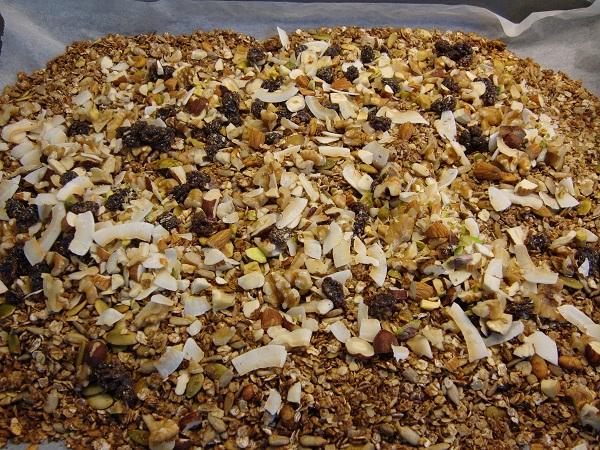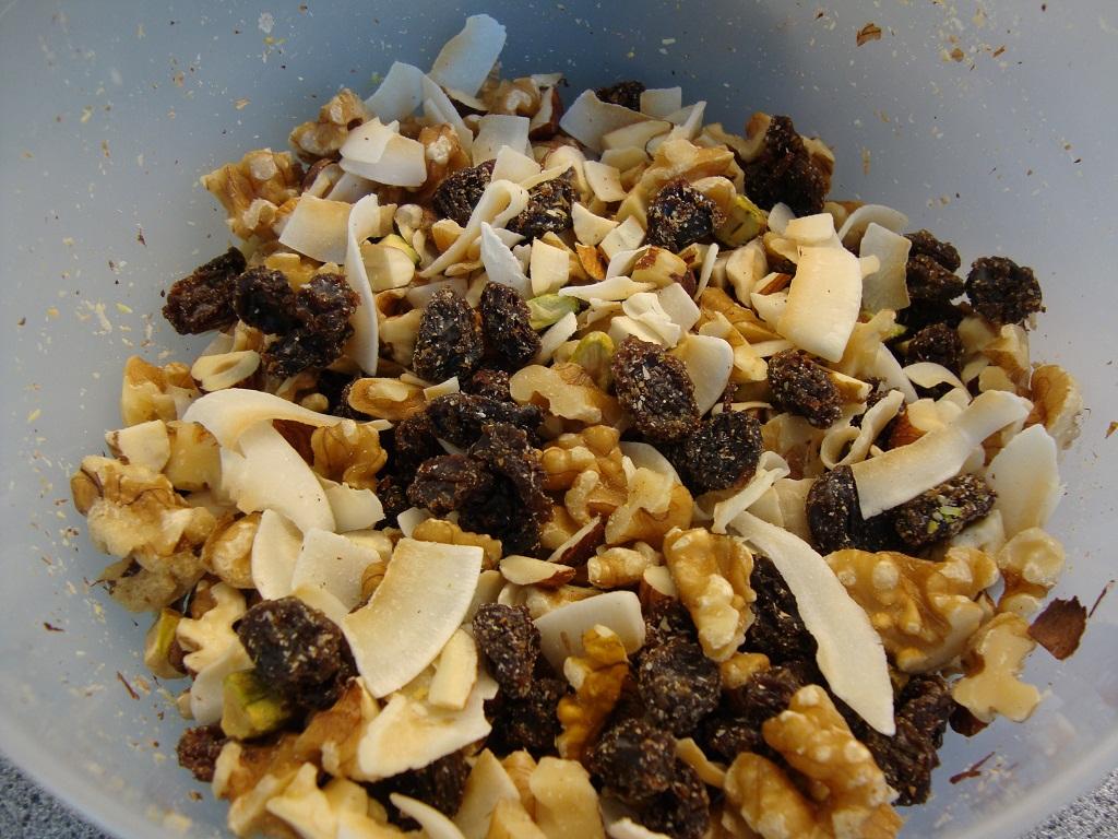 - (nötblandning, ej rostade i ugnen – kokoschips, hasselnötter, valnötter, sötmandel,pistagenötter och lite lite russin)