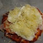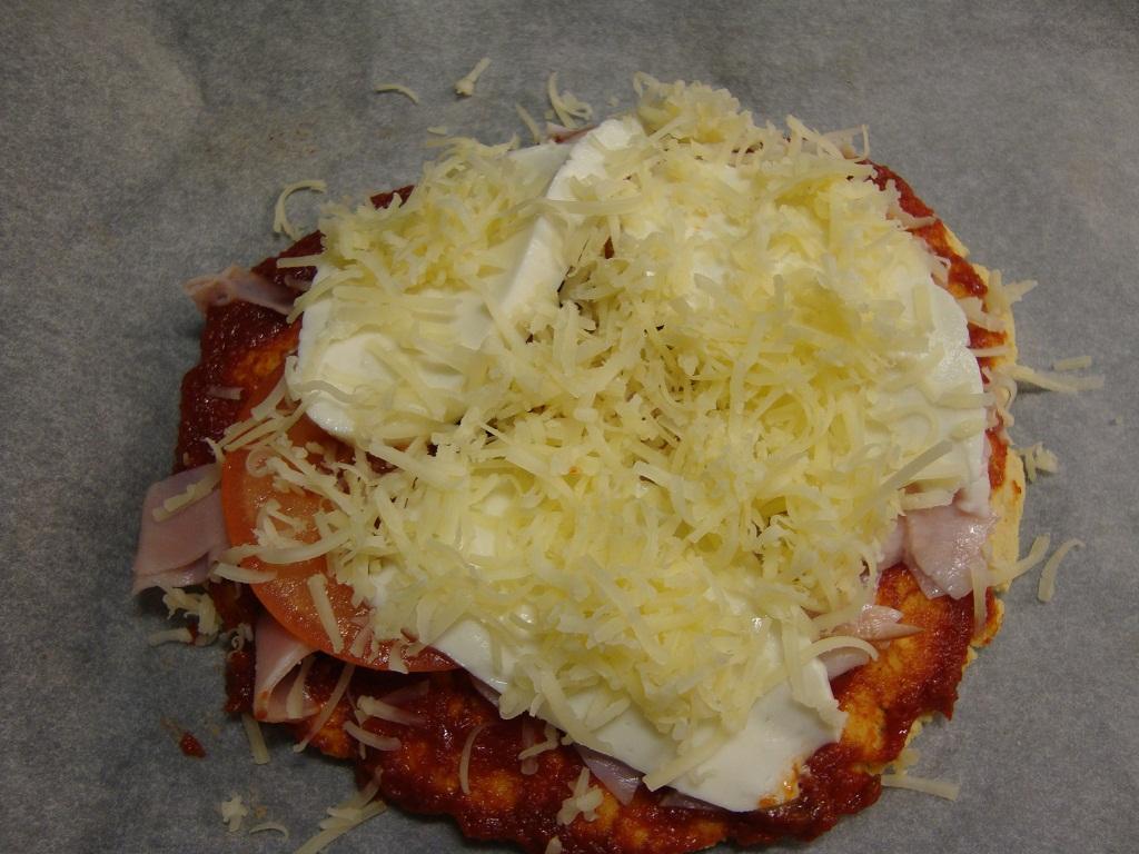 Vispa ägg fluffigt i några minuter, tillsätt vatten och blanda. Blanda de torra ingredienserna och blanda väl runt. Låt svälla i 5 min. Lägg degen på bakplåtspapper och kavla ut den med ett bakplåtspapper över degen, eller tryck ut den till lämplig tjocklek och storlek. Grädda i 200 grader i ca 7 minuter. Ta ut pizzabottnarna och sänk temperaturen till 175 och lägg på ”tomatsåsen”. Lägg på valfri fyllning och toppa med mycket riven ost (på våra pizzor hade jag skinka, tomater, lök, mozzarellaost och vanlig riven ost), grädda sedan i ugnen i 10 min.