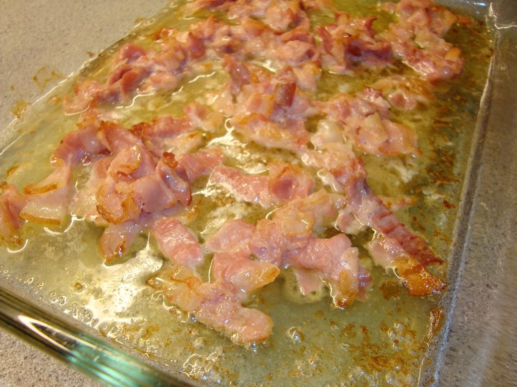 Sätt ugnen på 225 grader. Finstrimla bacon och fördela det i en långpanna med smöret i mindre klickar. Stek tills baconet blivit krispigt och fettet bubblar ordentligt. Vispa under tiden upp äggen med grädden och rör ner keson. Övervispa inte, det räcker att det blandar sig hyggligt. Strö riktigt små osttärningar på baconet och slå sen äggsmeten över. Grädda pannkakan i 18-20 min tills den har fått fin färg. Servera med lättsockrad lingonsylt eller bär om du tycker det passar bättre.