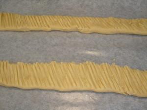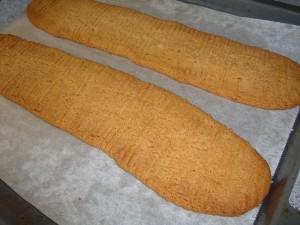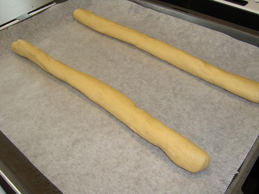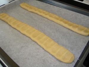 Lägg längderna på en plåt med bakplåtspapper och platta till dem lite.