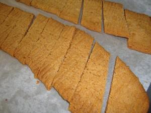Låt dem svalna en aning och skär sedan längderna på snedden. Låt kolasnittarna svalna på plåten.