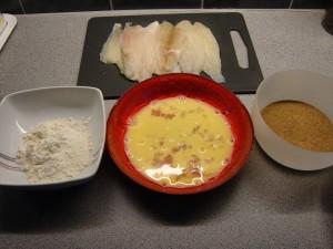 Häll upp mjölet i en djup tallrik. Kläck äggen och vispa upp dem med lite vatten och häll över i en annan djup tallrik. Sikta ströbrödet i en tredje tallrik/bunke.