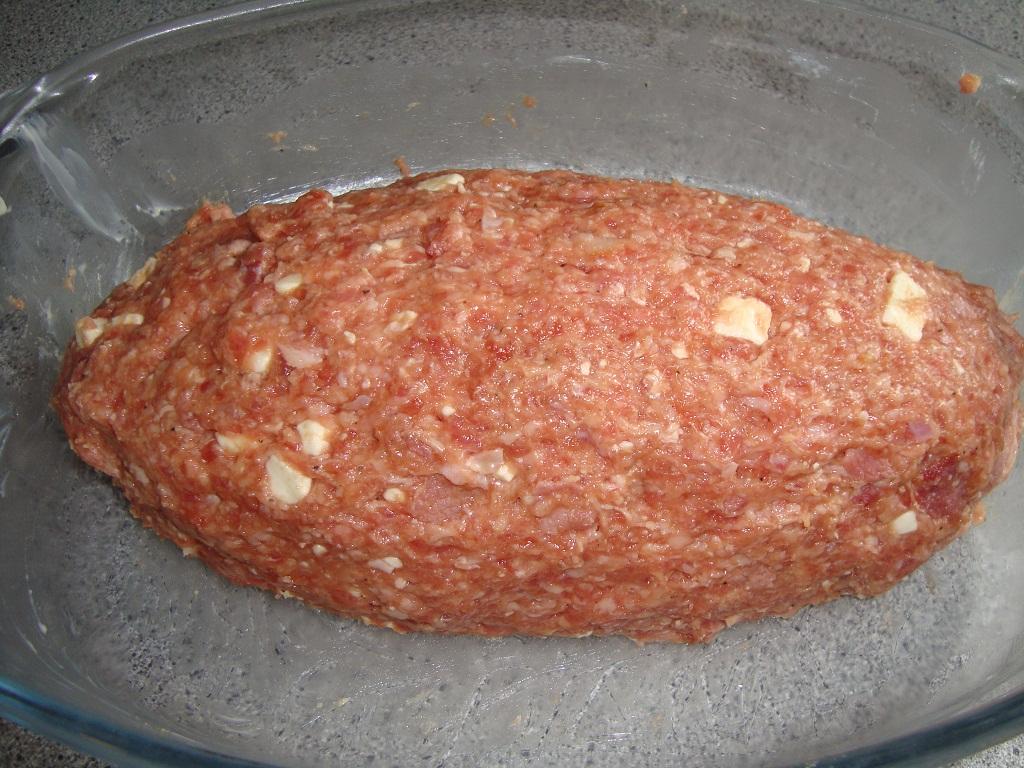 Sätt ugnen på 250 grader. Strimla baconet och stek. Blanda alla ingredienser ordentligt och lägg upp i en ugnsform i form av en limpa.