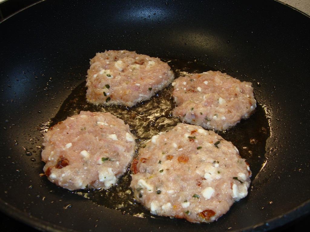 Lägg filéerna i en mixer/matberedare och kör till en färs. Skär bacon i strimlor. Skala och finhacka lök och vitlök. Hetta upp en panna med smör och bryn lök, vitlök och bacon i ngr minuter. Låt svalna. Smula fetaosten i en skål. Finhacka basilika och soltorkade tomater. Blanda fetaost, färs, lök, vitlök, bacon, basilika, tomater, salt och peppar i en skål. Forma smeten till biffar och stek dem i smör eller olja tills de är genomstekta.