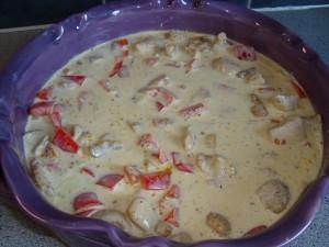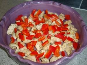 Börja med att göra klart kycklingen genom att skiva den i bitar, steka den i smör tills den är genomstekt. Lägg över kycklingen i en ugnsfast form och skär paprikan i bitar och strö över.