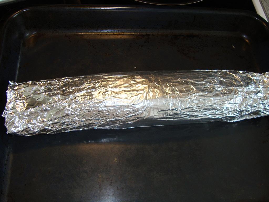 Packa in dubbelt aluminiumfolié till en hård rulle och låt ändarna vara öppna så att köttsaft och fett kan rinna ut, lägg rullen på en ugnsplåt och kör in den i 3 timmar på 100 grader.