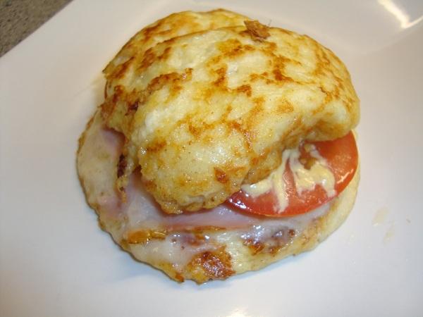 Hetta upp smör i pannan och klicka ut små plättar. Sänk till medelvärme och låt plättarna få fin färg på ena sidan (ca 4-5 min), vänd dem och lägg på osten på en plätt och sedan skinka, tomat och dijonsenap och lägg på den andra plätten. Låt gå ett tag till i pannan. Sedan är det bara att smaska på.