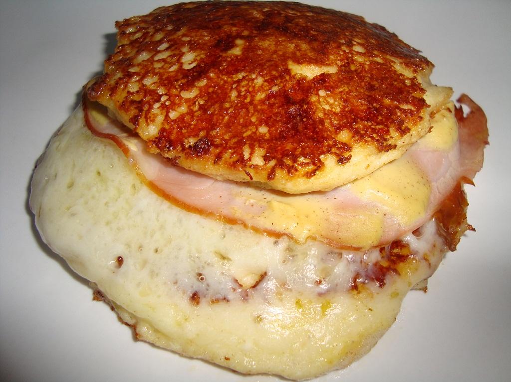 Hetta upp smör i pannan och klicka ut små plättar. Sänk till medelvärme och låt plättarna få fin färg på ena sidan (ca 4-5 min), vänd dem och lägg på osten på en plätt och sedan skinka, tomat och dijonsenap och lägg på den andra plätten. Låt gå ett tag till i pannan. Sedan är det bara att smaska på.