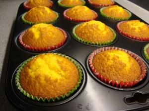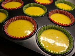 Sätt bakformarna i en muffinsplåt (går lika bra att göra utan muffinsplåt) och häll i smeten nästan ända upp och grädda i ugnen ca 15 min i 225 grader.
