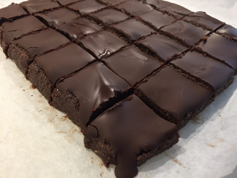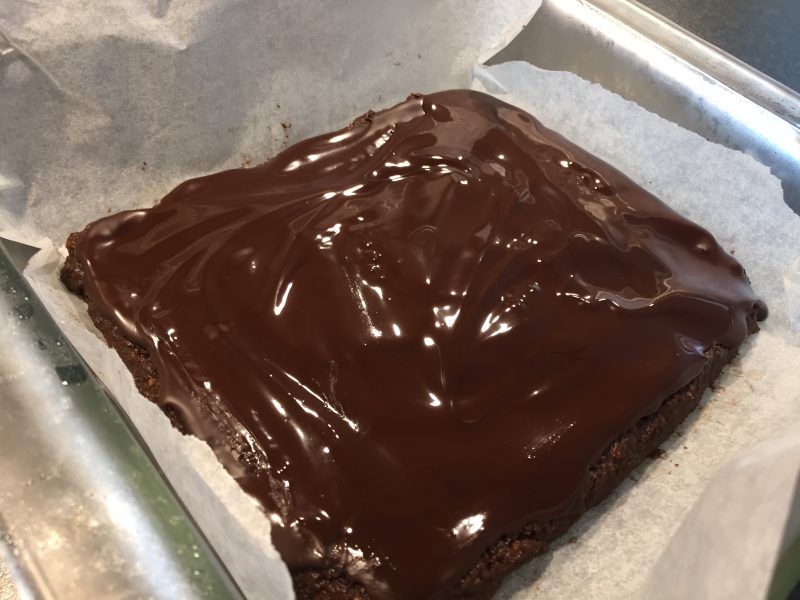 Kyl tills det stelnat. Om du nu vill ha choklad på dina fudge så är det nu du smälter den. Ta sedan ut och häll på chokladen över kakan och bre ut så det täcker hela kakan. Skär till rektangulära bitar i önskad storlek.