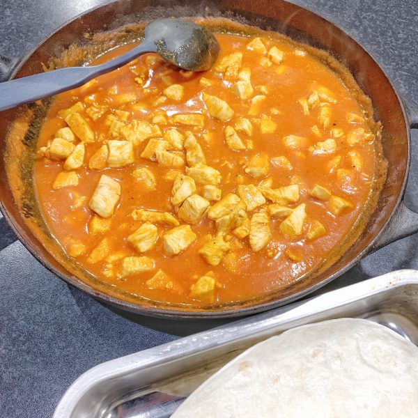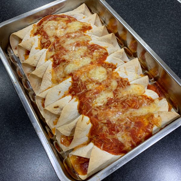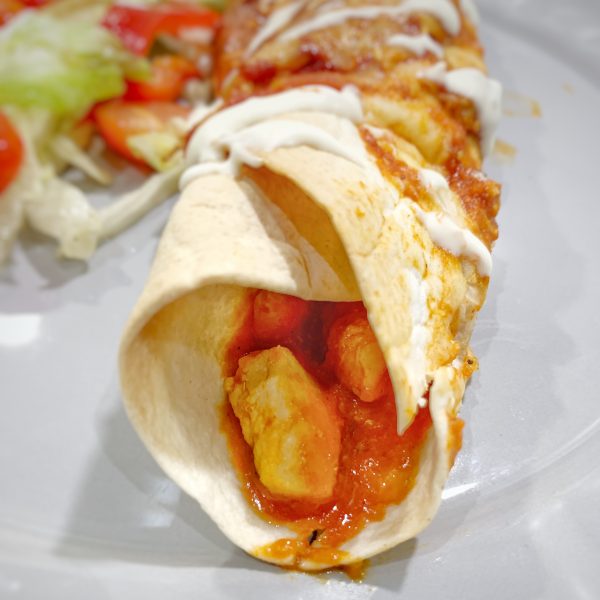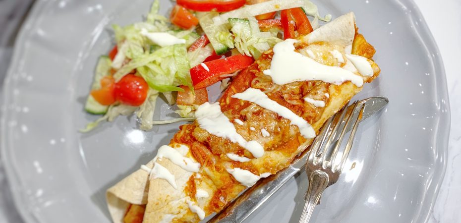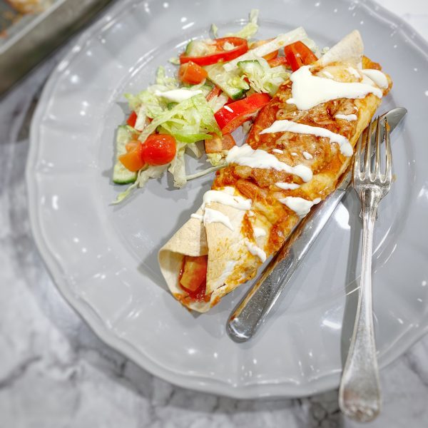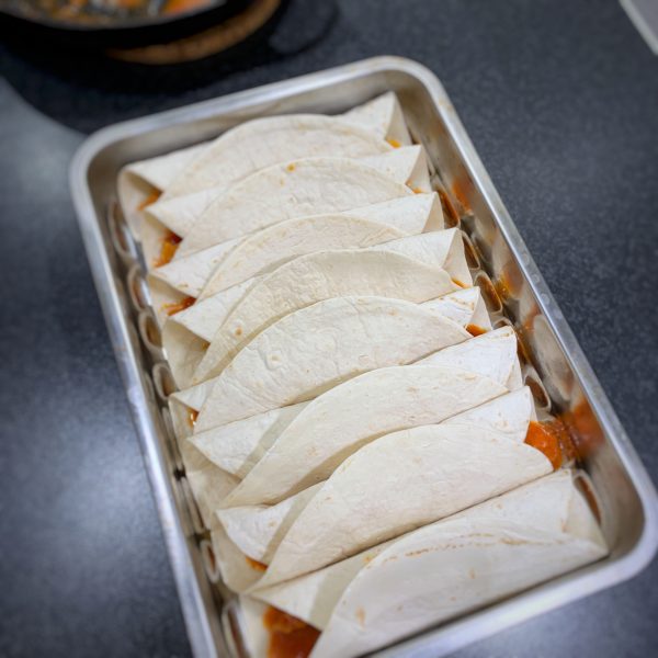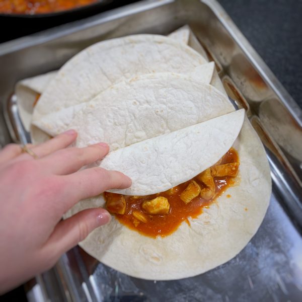 4. Fördela kycklingblandningen på tortillabröden, rulla ihop och lägg med skarven nedåt i en ugnssäker form.
