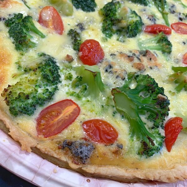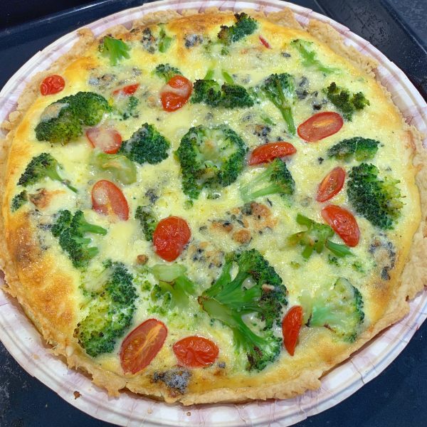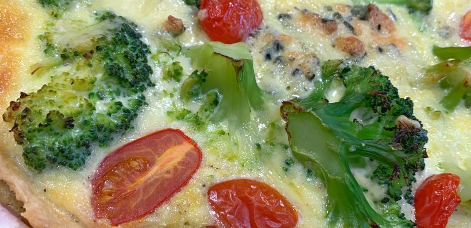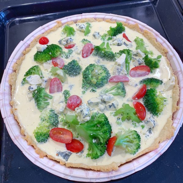 - Fyll sedan med broccolibuketterna (använder du fryst broccoli, koka dem i någon minut för att mjukna till något) och delade tomater, tärna ner ädelosten och vispa ihop grädde och ägg. Salta och peppra lite.