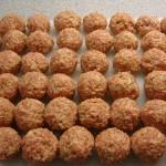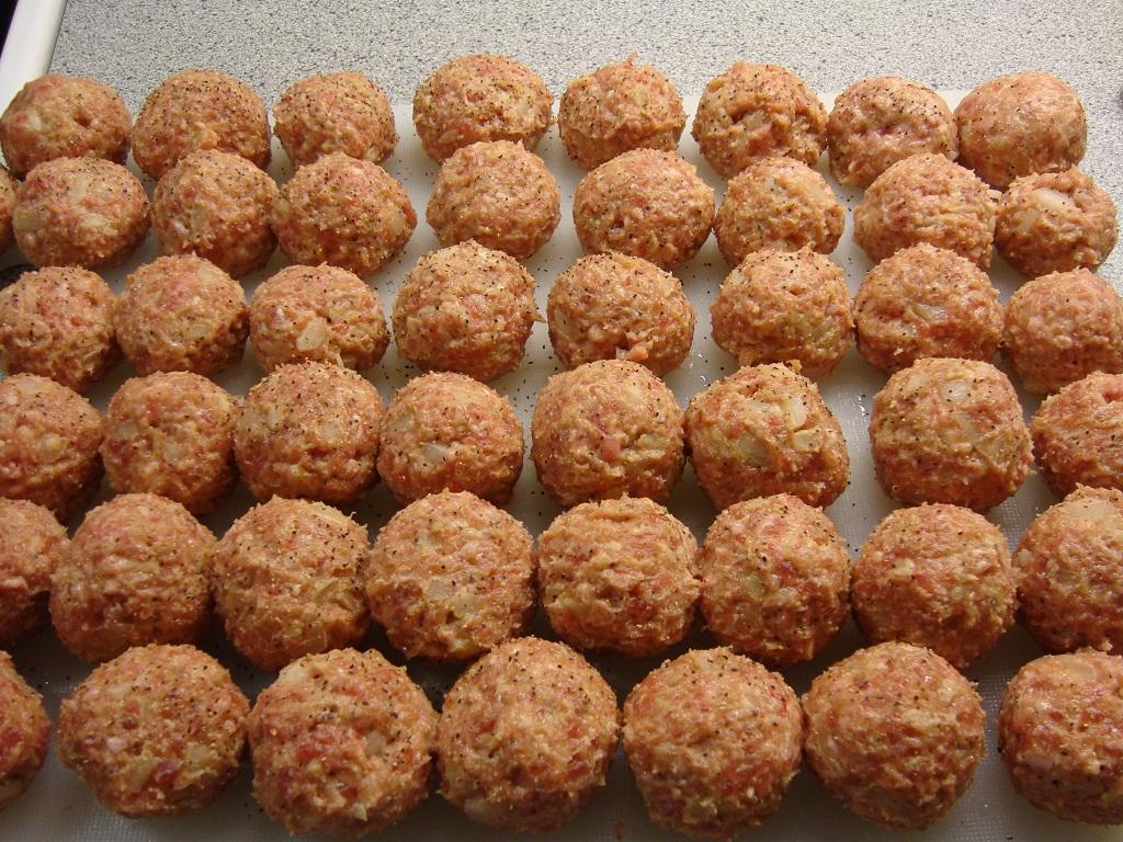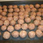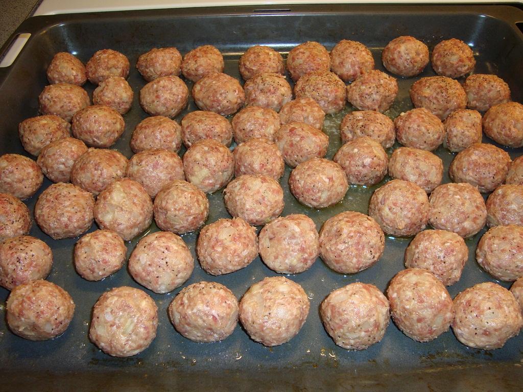 Sätt på ugnen på 200 grader. Finhacka löken och blanda med färsen i en bunke. Tillsätt kryddorna (efter eget smak och tycke). Vill man som jag då tillsätter man också en skvätt med kalvfond i smeten (1 1/2 msk ca). Häll i 2 dl grädde och äggen och blanda väl. Rulla köttbullarna till lagom storlek och lägg dom på en blöt skärbräda.