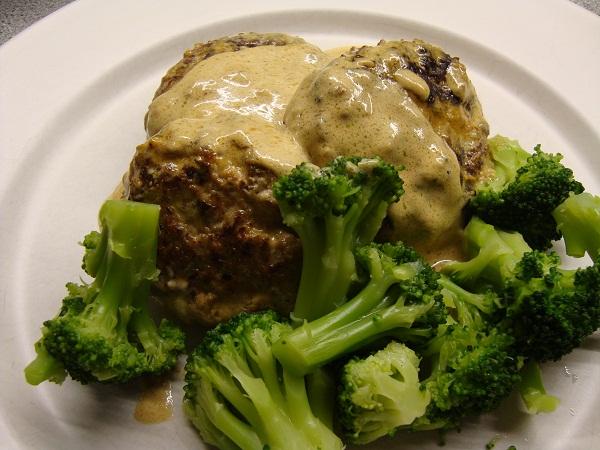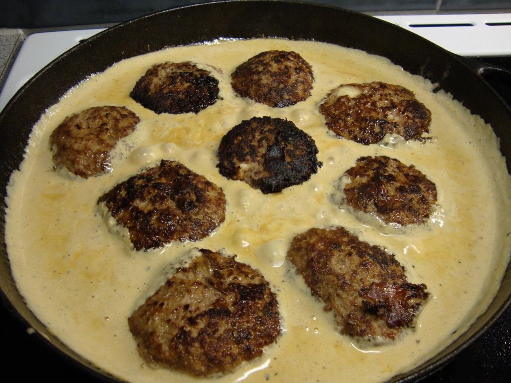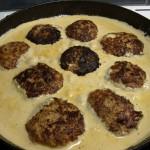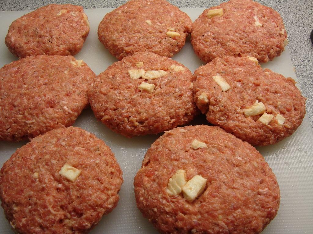 Blanda färs, ägg, grädde, kalvfond och mozzarella skuren i små kuber. Salta & peppra. Forma 6 st biffar (beroende på storlek).