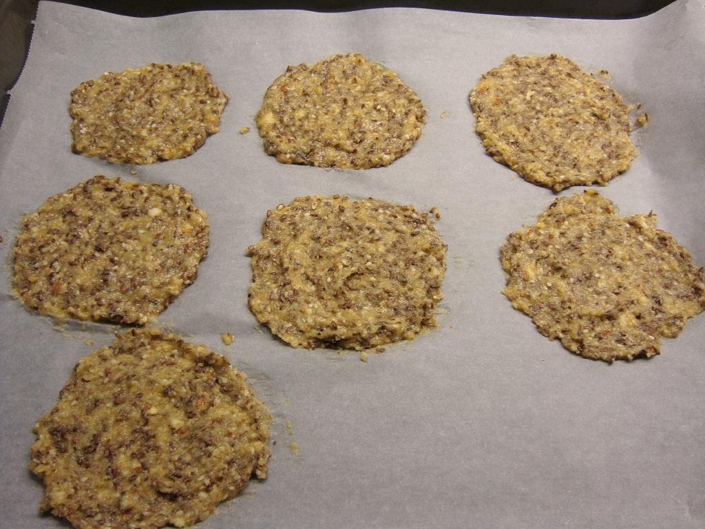 Sätt ugnen på 150 grader. Smält smöret. Mixa linfrö, mandel och sesamfrön i en matberedare (jag använde vanlig stavmixer) Lägg över i en bunke och blanda med fiberhusk, ägg, salt och smält smör. Klicka ut ca 10 runda bröd på en plåt med bakplåtspapper med en sked, försök att göra dom så tunna som möjligt (3 mm ca) Jag fick bara ut 7 st, men går säkert göra mer om man gör dom tunnare. Grädda knäckebröden i 20 min, stäng sedan av värmen och öppna ugnsluckan och låt dom stå och rostas i 30 min till. Dessa knäckebröd ska förvaras torrt och kallt.