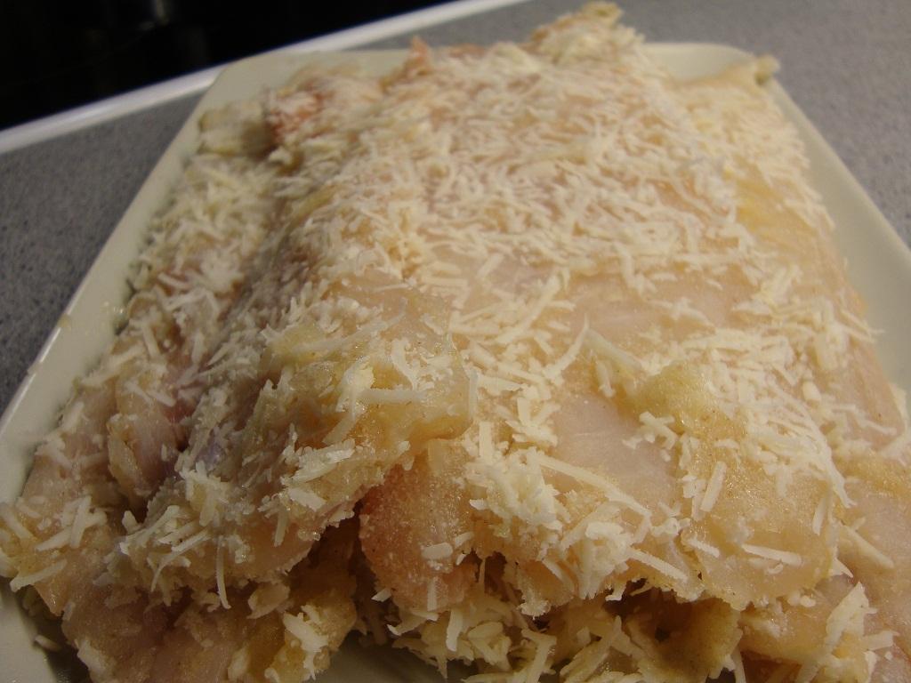 Vispa upp ägget lätt med en gaffel på en tallrik. Krydda fiskbitarna på båda sidor (detta missade såklart jag, därför min fisk inte smakade så mycket). Strö över fiberhusk, så det täcker båda sidor, ett tips är att använda saltkar, men går bra utan. Doppa fisken i det uppvispade ägget. Låt rinna av lite och doppa sen i riven ost. Tryck till fisken ordentligt mot osten, så den fastnar överallt. Lägg på ett fat och låt torka fast en stund.