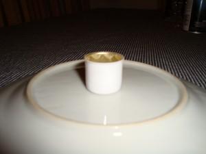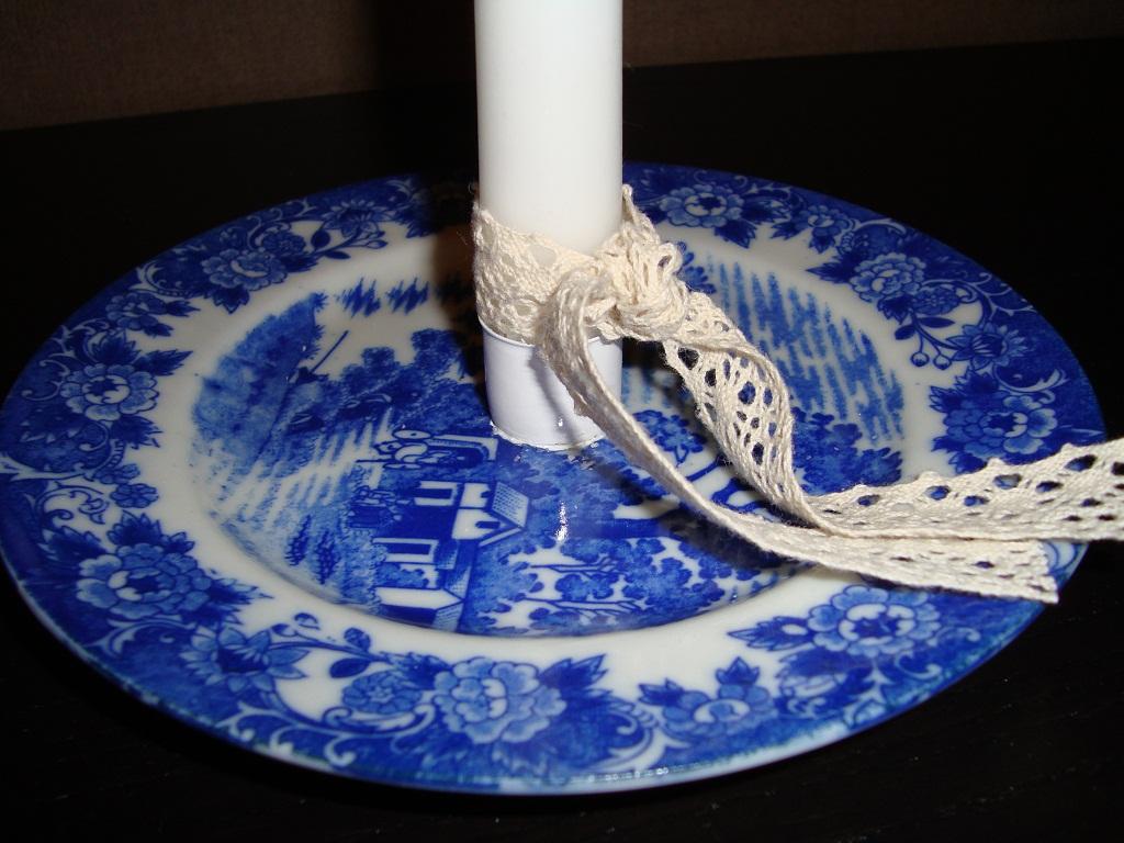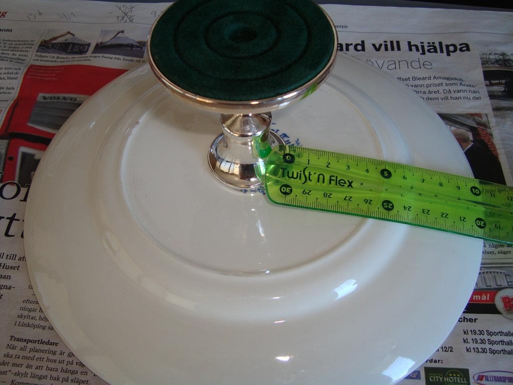 För att få foten precis i mitten mäter du undersidan på tallriken. Sedan mäter du foten på den sidan du ska limma fast. Ta sedan de måtten minus varandra. Mät vardera sida om ljusstaken och se så att det stämmer. Limma sedan kanten på ljusstaken och håll fast den en stund så att det fäster på tallriken, jag använde karlssons klister.