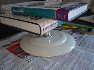 För att slippa stå och hålla fast ljusstaken så att limmet torkar så kan du underlätta det genom att lägga tyngd på staken, som jag gjort ovan med böcker.
