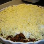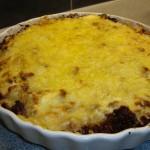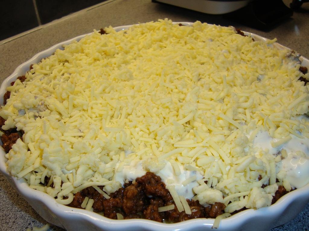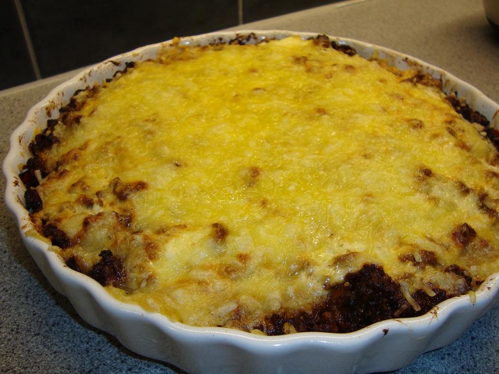 Receptet på denna paj hittade jag här och sen gjorde jag en egen köttfärsröra på det och såhär blev det:
