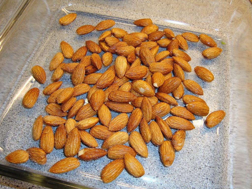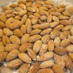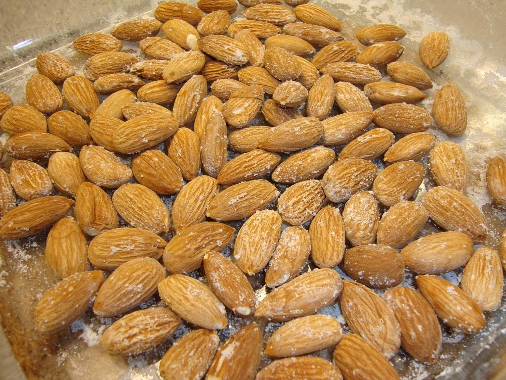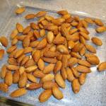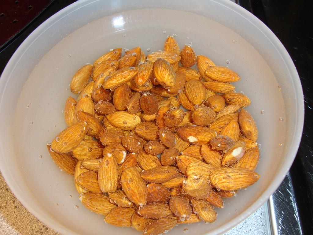 De salta och rostade mandlarna gör du enklast genom att lägga en valfri mängd mandlar i blöt under tiden ugnen värms upp till 225 grader.