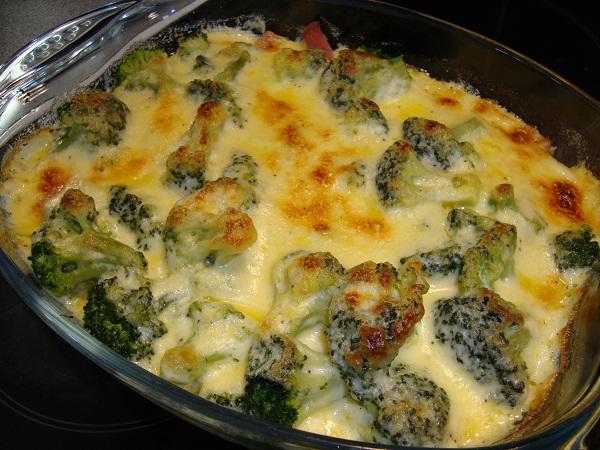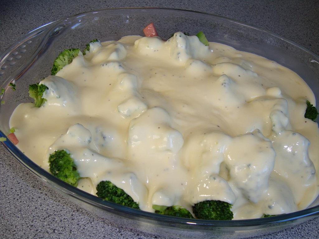 Nu är det dags att göra ostsåsen och du börjar med att smälta smöret i en kastrull (2msk), Späd under vispning med grädden. Smaka av med salt och peppar. Rör ut äggulan med lite grädde och vispa ner i såsen. Tillsätt osten och låt den smälta ner utan att koka såsen. Häll såsen över korven och broccolin och sätt in i ugnen i ca 20 min eller tills den fått fin färg.