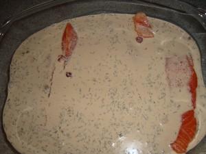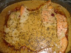 Blanda grädde, viltfond, sylt, peppar och timjan. Häll över laxen.
