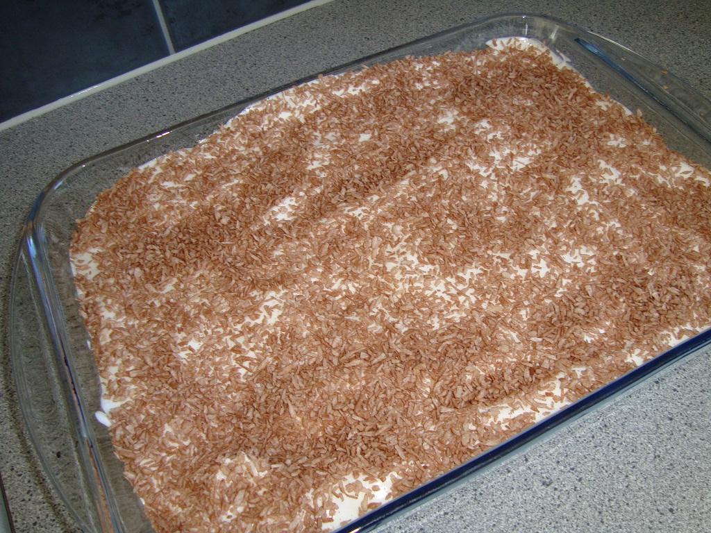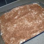 11. Häll/klicka och bred ut smeten i formen och strö över strösslet. Spara övrigt strössel tills senare.