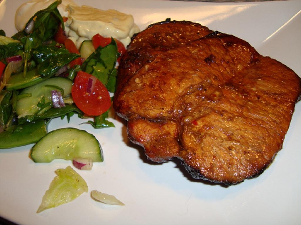 Igår blev det som sagt lite grillat på kvällen och igår blev det att grilla fjärilskotletter, till det serverade vi salladen och vitlökscreme fraichen som blev över från lunchen. Mycket gott!