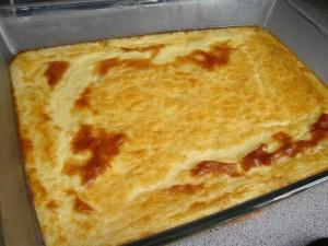 Koka upp grädden och ca 2,5 dl av mjölken i en kastrull. Vispa äggen med den sista decilitern mjölk i en bunke. Häll sedan på resten av ingredienserna och blanda dem ordentligt. Salta och häll smeten i en smord och ugnsfast form. Grädda omeletten i mitten av ugnen i 200 grader ca 20 minuter eller tills omeletten fått fin färg.