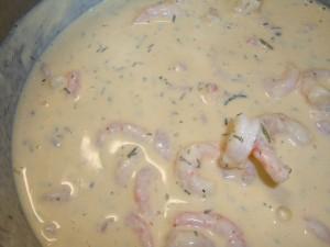 Blanda grädde, philadelphia, fonden och kryddorna och häll i en kastrull. Låt det puttra i ca 10 min eller tills såsen känns tjock nog. När stuvningen känns bra i konsistensen tillsätter du dillen och smakar sedan av. Rör sedan ner räkorna i stuvningen och när omeletten är klar i ugnen häller du över stuvningen. Klart att servera!