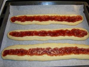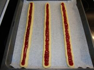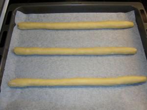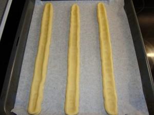 Dela degen i 3 delar och forma dem till en boll som du sedan rullar ut till smala rullar som är lika långa som bakplåten. Lägg längderna på bakplåtspapper på en bakplåt.