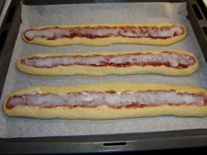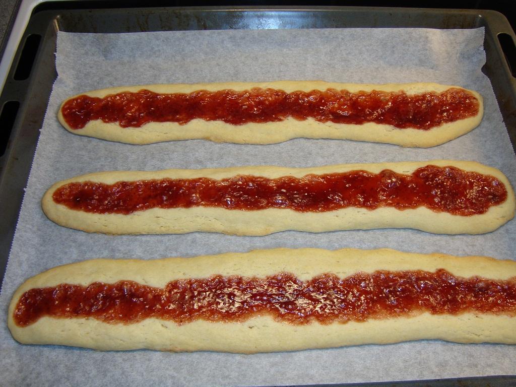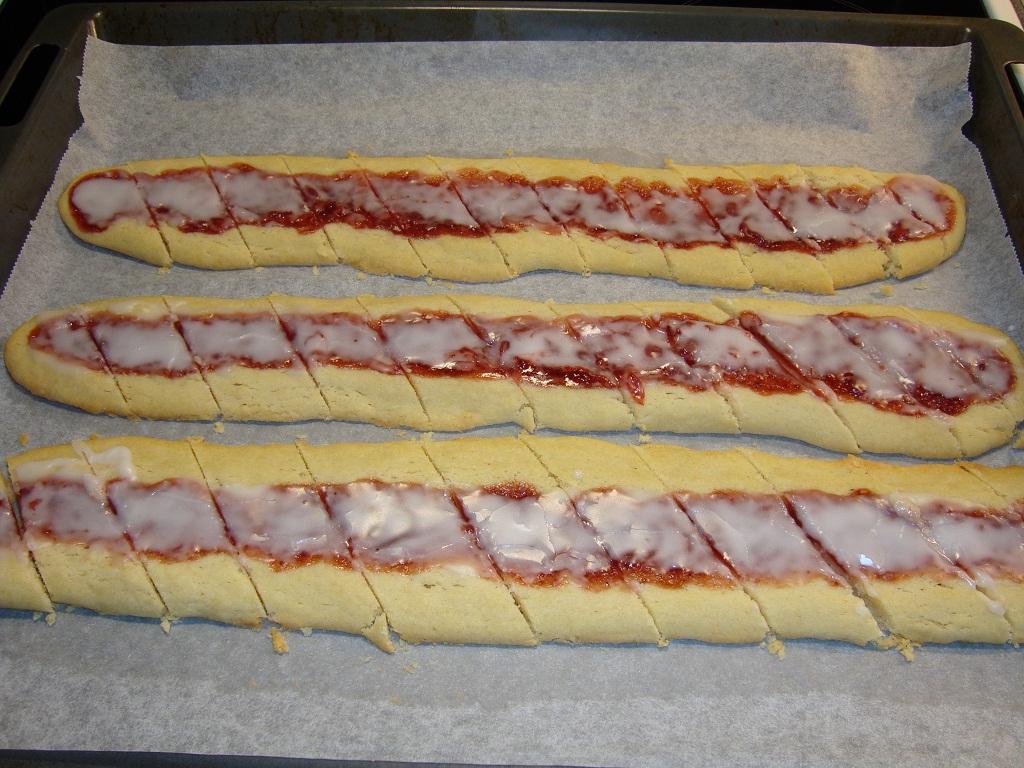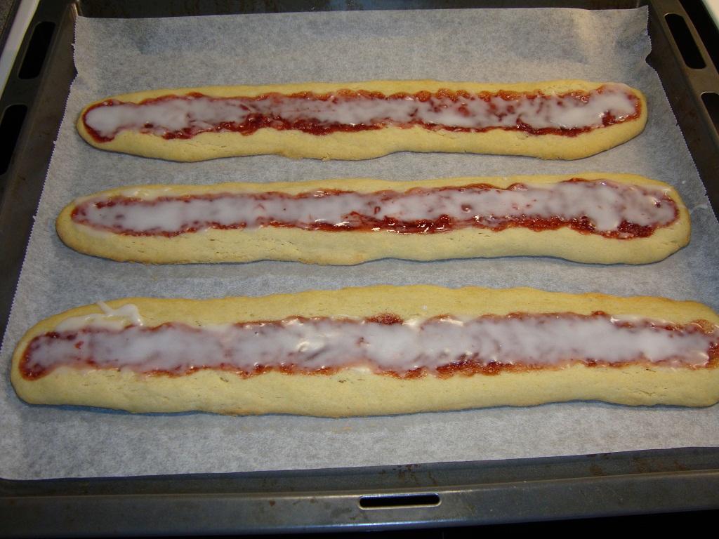Grädda längderna mitt i ugnen i 175 grader i ca 15 minuter. Låt längderna svalna några minuter, de får inte bli kalla innan du breder på glasyren.