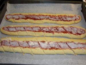 Skär längderna i sneda bitar med en vass kniv medan de fortfarande är lite varma. Låt dem sedan kallna på plåten.