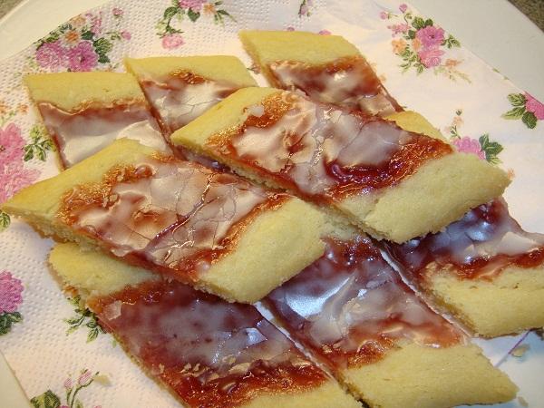 Gör glasyren: Blanda florsocker och vatten och bred över sylten. Låt sedan kakorna vila ca 10 minuter tills glasyren stelnat lite.