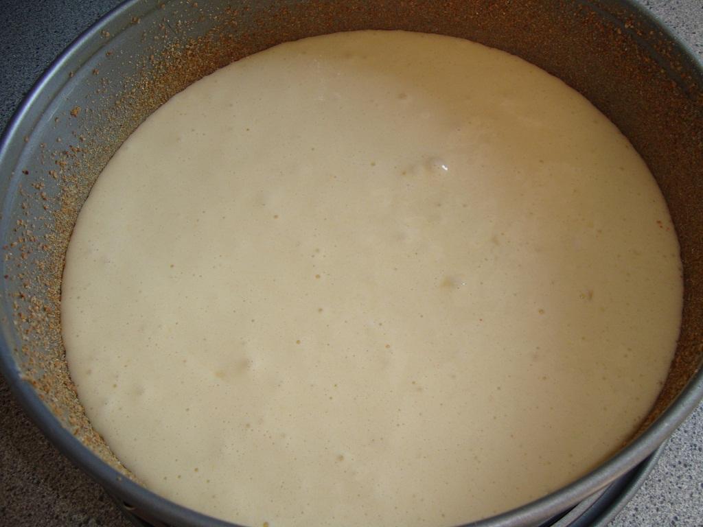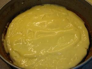 Vispa ägg och socker vitt och fluffigt. Rör ner övriga ingredienser med en slickepott och häll smeten i en smord springform.