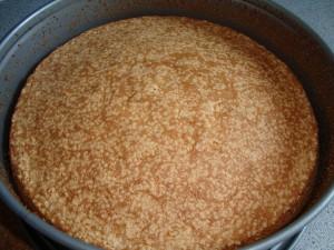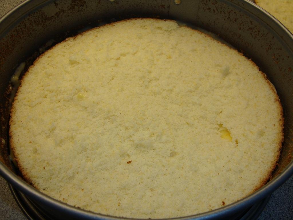 Låt svalna och dela sedan tårtbotten i tre skikt. Lättast är om du vänder på bottnen och skär den åt det hållet.