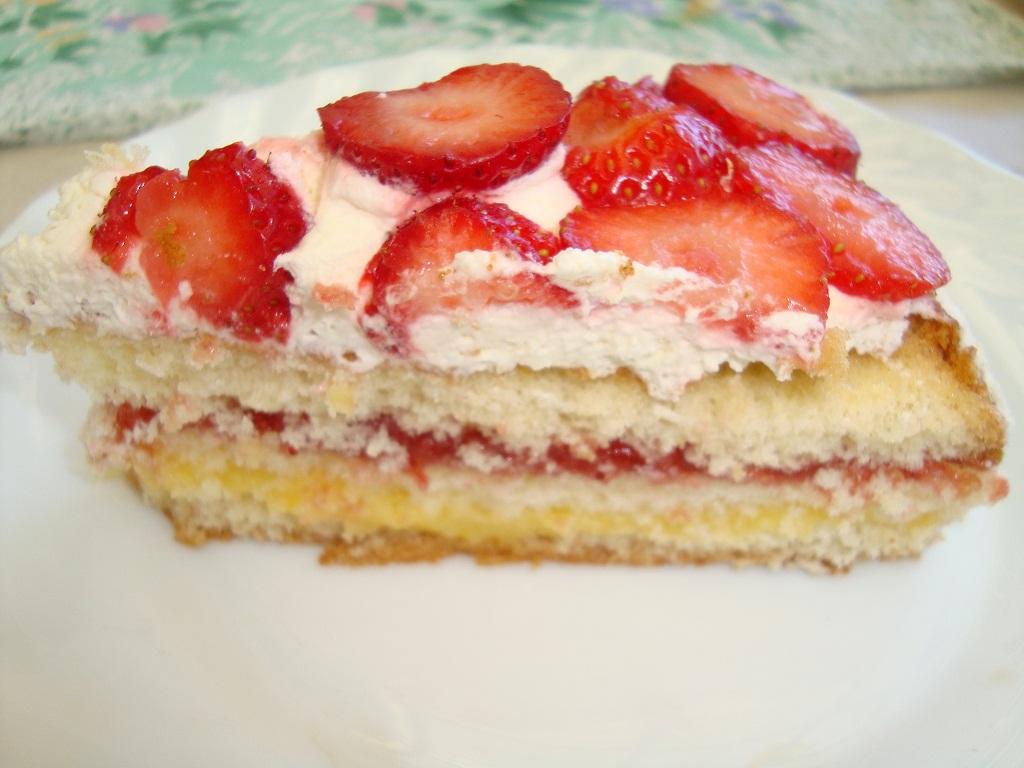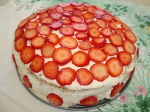 Sedan lägger man den sista tårtbotten på sylten och dekorerar med mycket vispgrädde och massa jordgubbar!