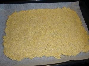 Ta fram en plåt med bakplåtspapper och bred ut smeten med en sked tunt till den blir ca 30×30 cm.