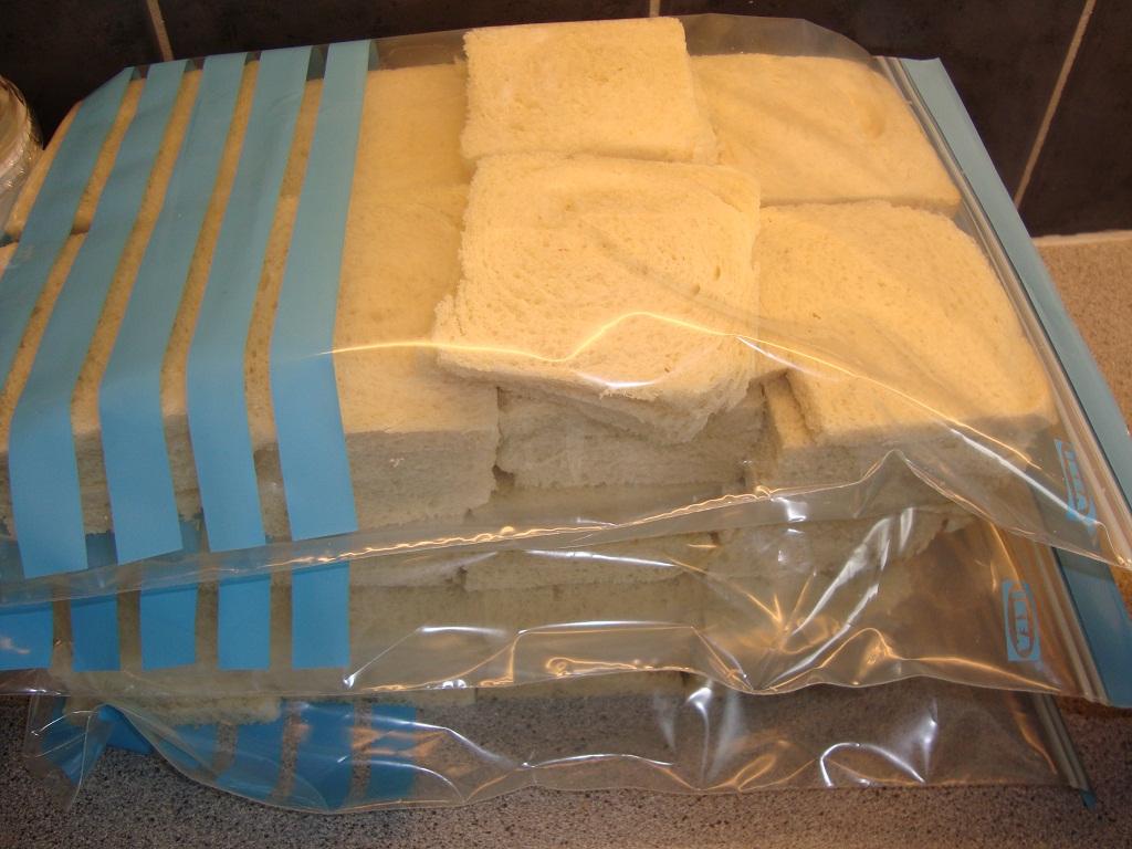 Börja med att skära bort kanterna på brödet och lägg det i en påse så länge.