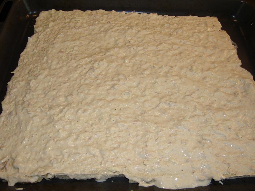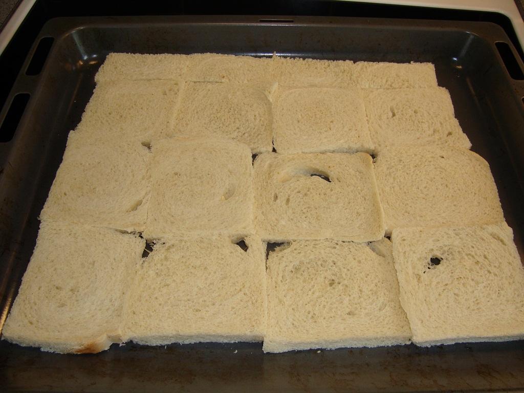 Lägg ut brödet på plåten, man får pussla lite så att det blir lite mellanrum mellan brödet och plåten.