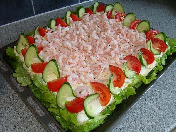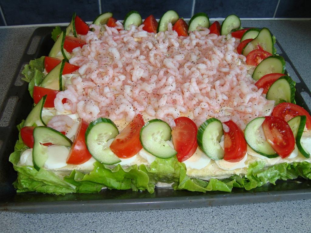 Jag lägger hela toppen av tårtan med ägg först, sedan salladen runt om, och sen varvar jag gurka och tomater och sist lägger jag på räkorna och kryddar lite till med citronpeppar. Klar att servera :)