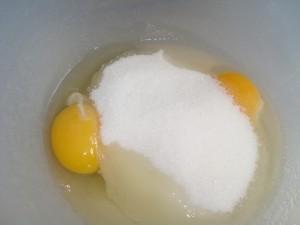 Smält smöret, ta av från plattan och tillsätt mjölken. Vispa ägg och socker pösigt.