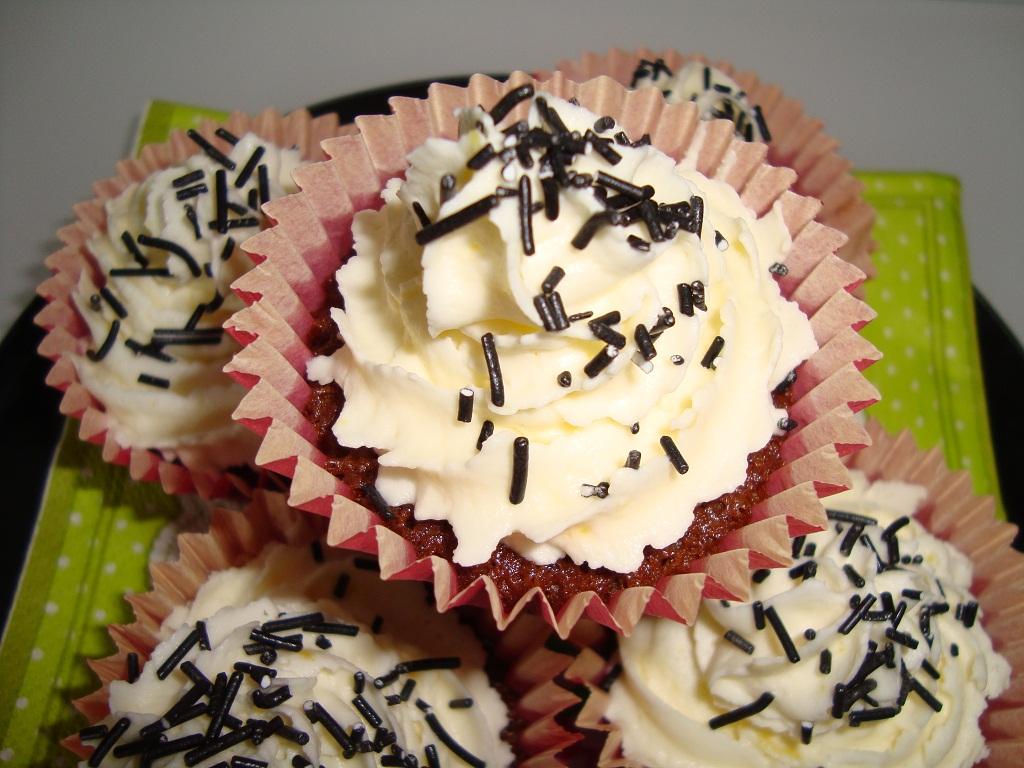 Ta fram citronfrostingen och spritsa över muffinsen. Jag dekorerade lite med svart strössel som jag hade hemma.