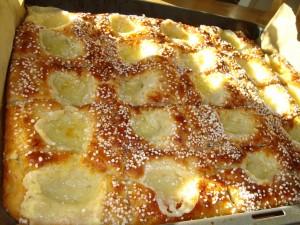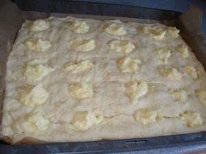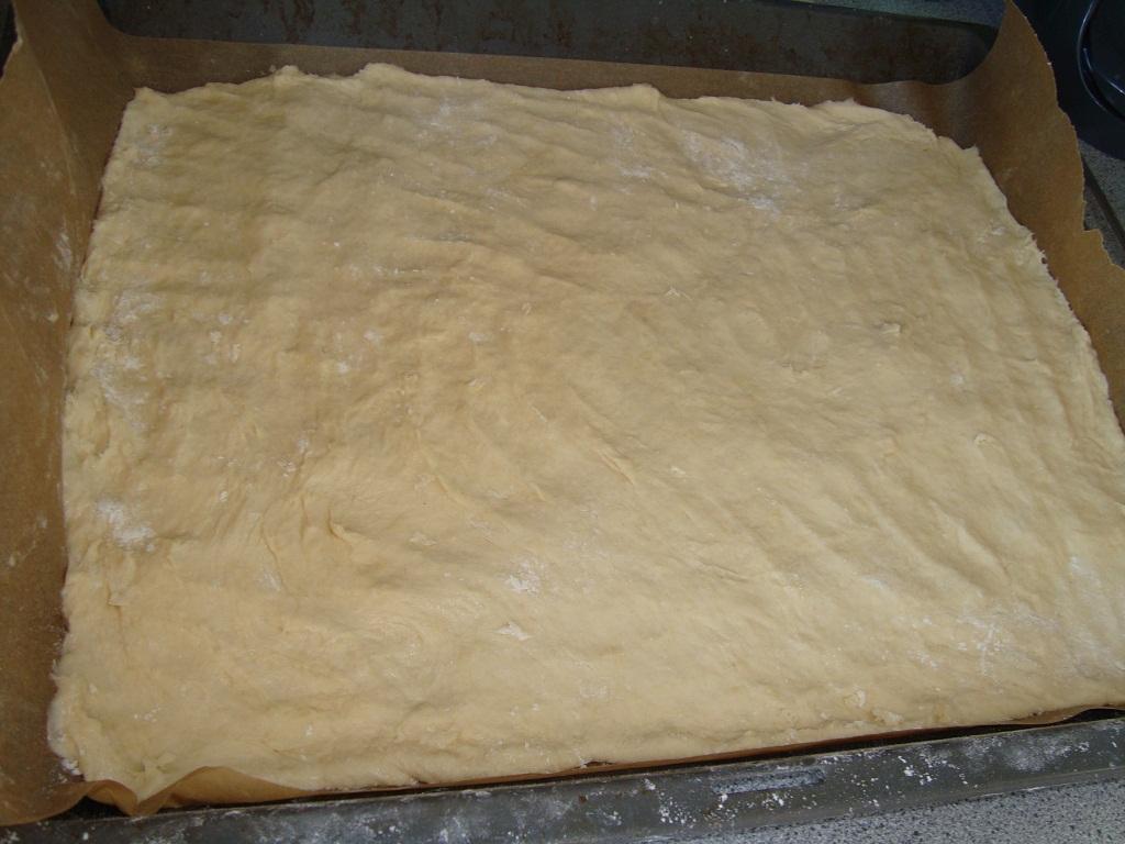 Värm mjölken till 37 grader och smula ner jästen i en bunke. Häll mjölken över jästen och rör tills den helt har ”smält”. Tillsätt det rumsvarma smöret, sockret, saltet och nästan allt mjöl. Arbeta degen smidig, gärna i maskin eller gör som jag och använd elvisp med degkrokar. Ta fram en ugnsplåt och lägg på bakplåtspapper och fördela degen jämnt, tryck ut degen med mjölad hand till kanterna (degen blir lös och kladdig, men det ska vara så).