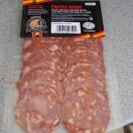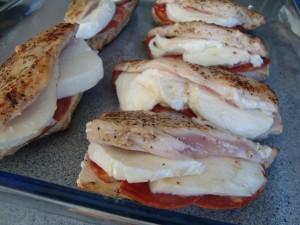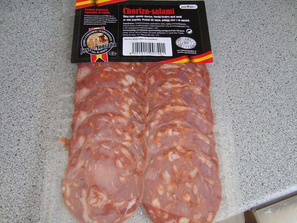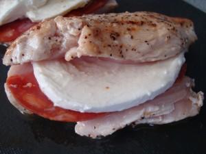Skär ett snitt i kycklingen (gör inget om den inte är färdigstekt). Fyll sedan kycklingen med några skrivor chorizosalami och mozzarella.