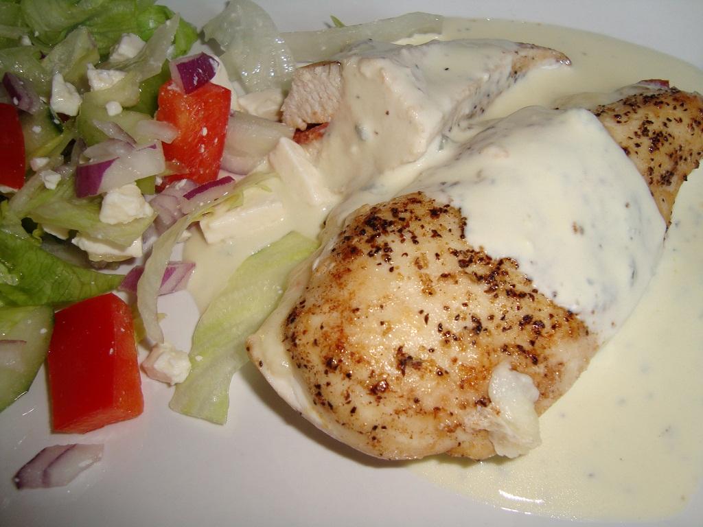 Häll i grädde och creme fraich i en kastrull, värm sedan upp och tillsätt ädelosten i mindre bitar tills den smält. Krydda med salt och peppar och smaka av. Låt små bubbla en stund tills kycklingen är klar.