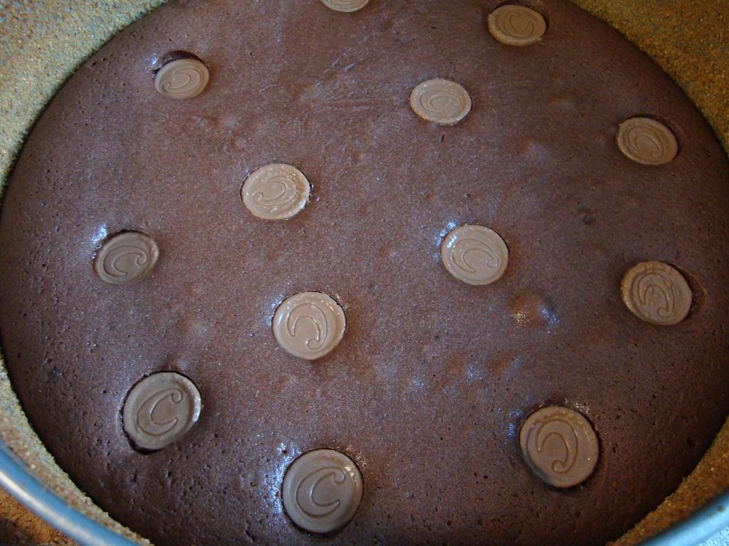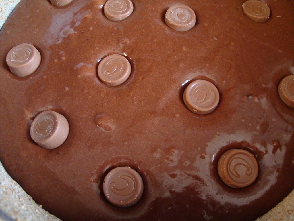 Sätt ugnen på 200 grader, smörj sedan en form med löstagbar kant, ca 22 cm i diameter. Smält smöret. Vispa ihop ägg och socker lite lätt. Blanda mjöl och kakao i äggsmeten och ha sedan i det smälta smöret. Häll smeten i formen. Tryck ner Center i smeten och grädda i mitten av ugnen i ca 10-12 minuter.