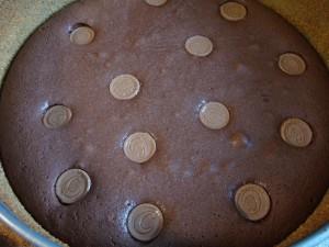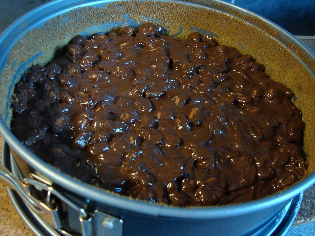 Under tiden kakan svalnar gör du toppingen genom att smälta chokladen över vattenbad och när all choklad smält tillsätter du de salta jordnötterna och blandar runt tills alla nötter är täckta med choklad. Bred sedan blandningen över kakan och låt svalna i kylen tills chokladen stelnat. Har man lite bråttom så kan man ställa in den i frysen i 20 min och sen resten av tiden i kylen.